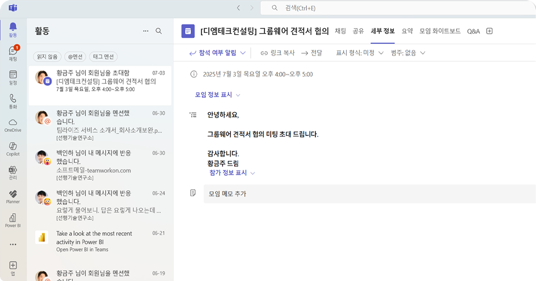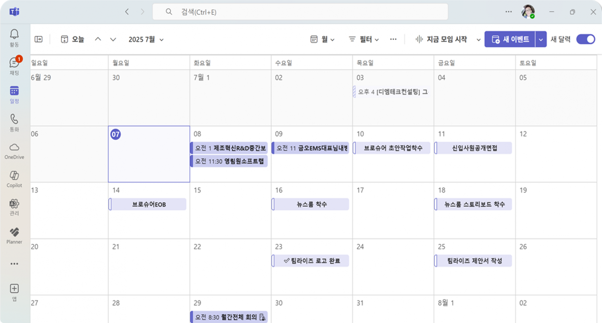 • 클라이언트 미팅, 내부 회의 등의 일정을 캘린더에서 통합관리할 수 있습니다. Outlook 및 Teams 일정과 연동되어