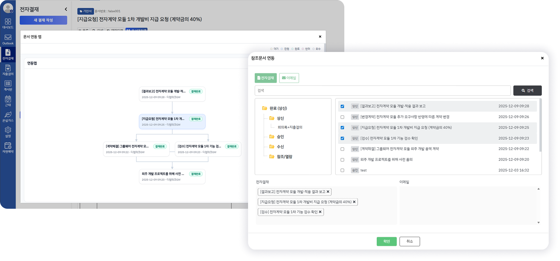 • 전자결재 진행 흐름을 한눈에 파악할 수 있는 연동 맵을 제공하며, 이전에 상신한 문서를